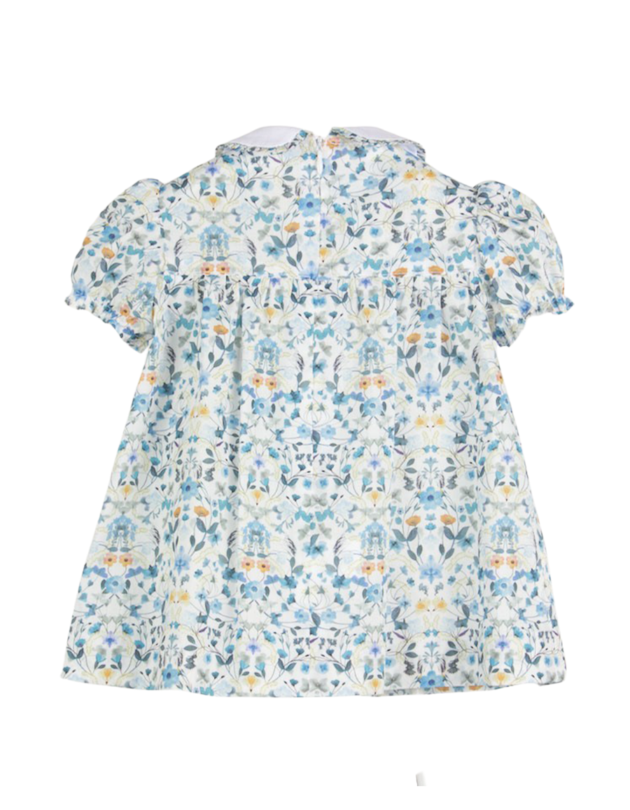 Fresco abito in tessuto liberty azzurro, con colletto rotondo bianco, manica corta arricciata all'attaccatura e vita alta evidenziata da una graziosa fascia elasticata che rende questo capo, ancora più ampio ed elegante.
