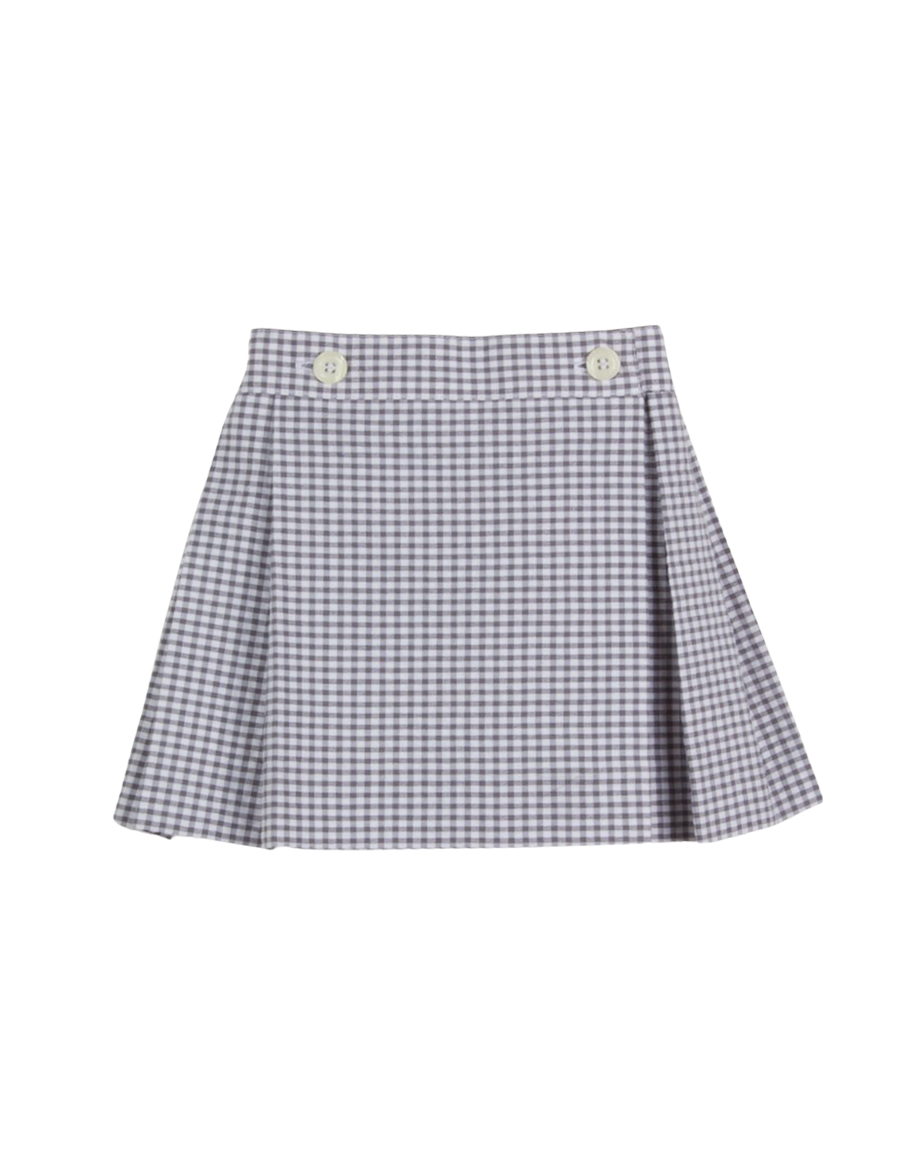 Pratica ed elegante gonna a pieghe, con un ampio pannello centrale chiuso in vita da due bottoni in madreperla ed arricciata in vita dietro