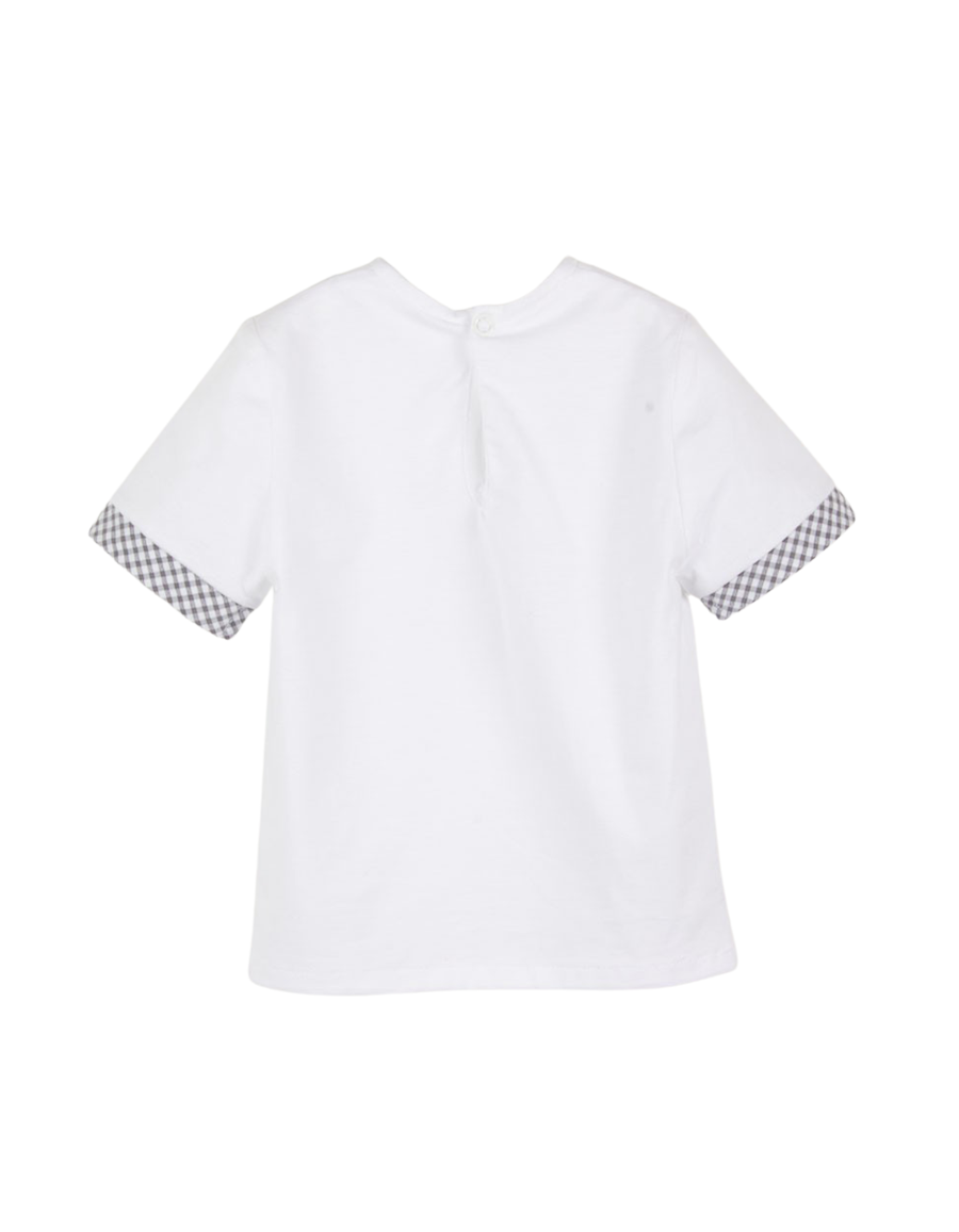 Graziosa maglietta bianca in jersey di cotone, con ricamato al centro uno spiritoso pulcino, manica corta profilata in tessuto quadrettato e girocollo rotondo.