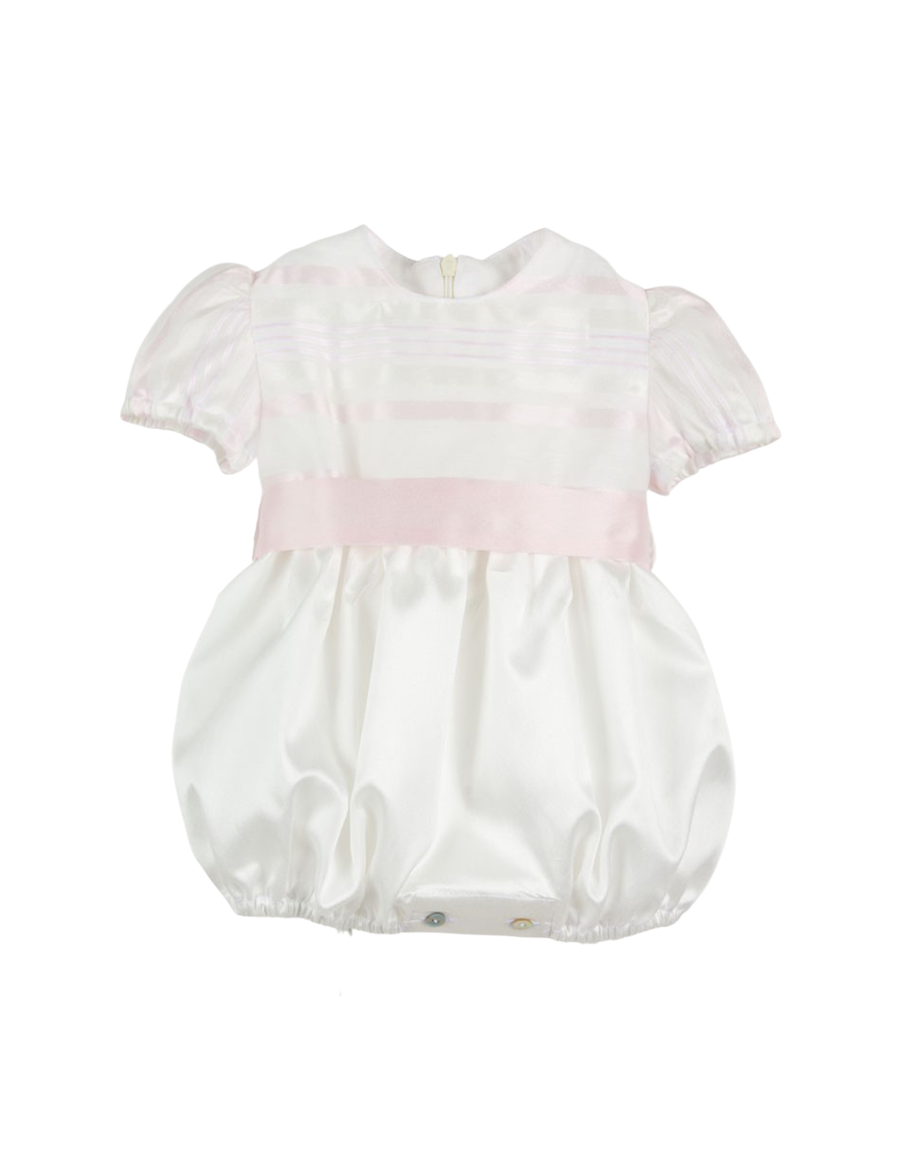 Importante pagliaccetto in tessuto bianco e rosa lavorato in orizzontale nel corpino e schantung bianco la parte inferiore.La manica corta, la chiusura al cavallo con bottoni, la cerniera a scomparsa dietro e la cintura rosa chiusa da un grande fiocco, sono i particolari che rendono esclusivo questo capo.